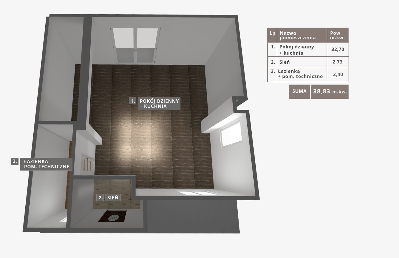 Mieszkanie 74,95m2, dwupoziomowe. Na pierwszy poziomie o pow.37,91m2, znajduje się salon(24,23m2) z częścią kuchenną(7,84m2),WC (3,38m2) oraz wiatrołap (2,46m2). Z salonu jest wyjście na taras i bezpośrednio do ogródka.