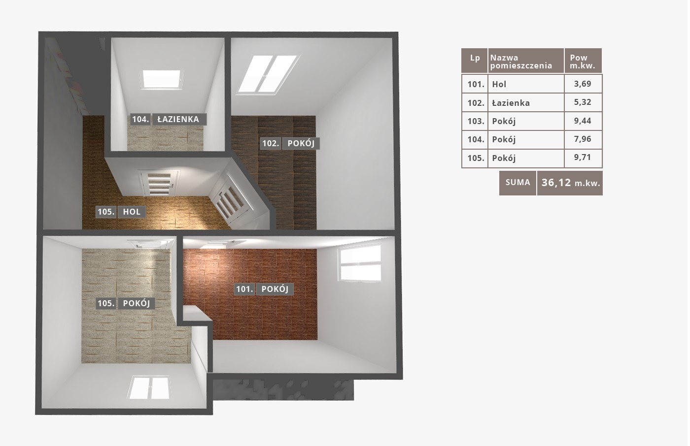 Drugi poziom ma powierzchnię 36,17m2 na która składa się trzy pokoje (9,74m2; 7,96m2; 9,42m2), łazienka o pow.5,33m2 oraz przedpokój o pow. 3,72m2. Istnieje możliwość przearanżowania ścianek działowych celem posiadania bardziej przestronnych dwóch sypialni.